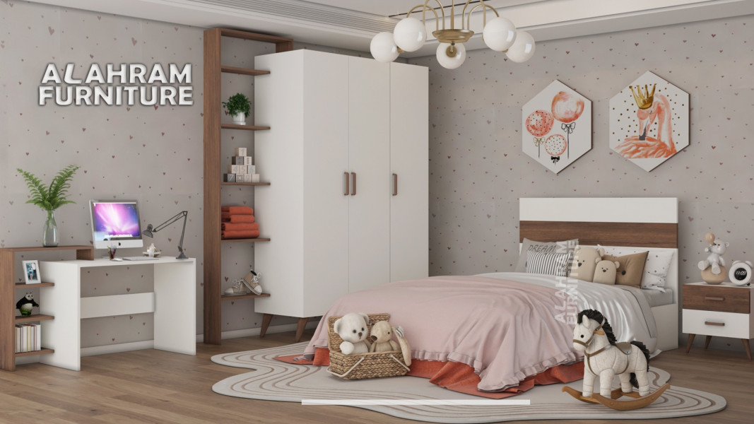 3- غرفة نوم اطفال : دولاب 100 سم + سرير + كمود خشب زان احمر × مسطحات كونتر طبيعي